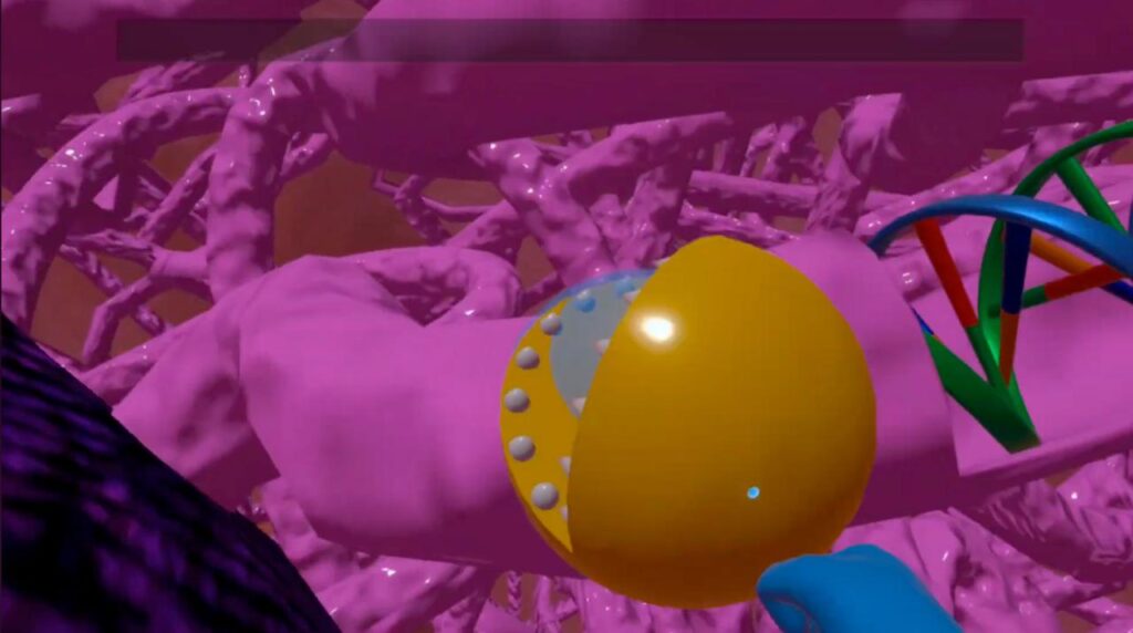 An interactive VR biology simulation where students enter a cell, activate enzymes, repair molecular damage, and restore cellular function step by step.